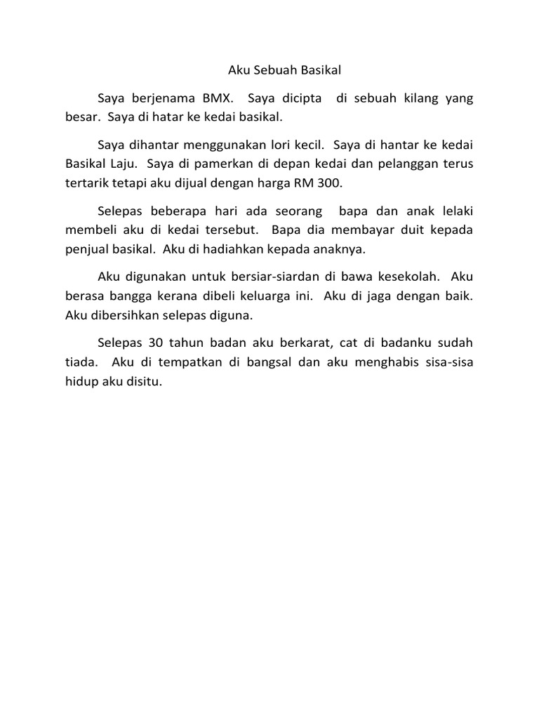 Tuliskan sebuah karangan yang bertajuk aku sebuah basikal. Bahasa Melayu BM Gradelevel. Aku dilahirkan di sebuah kilang yang terdapat di Selangor Darul Ehsan.